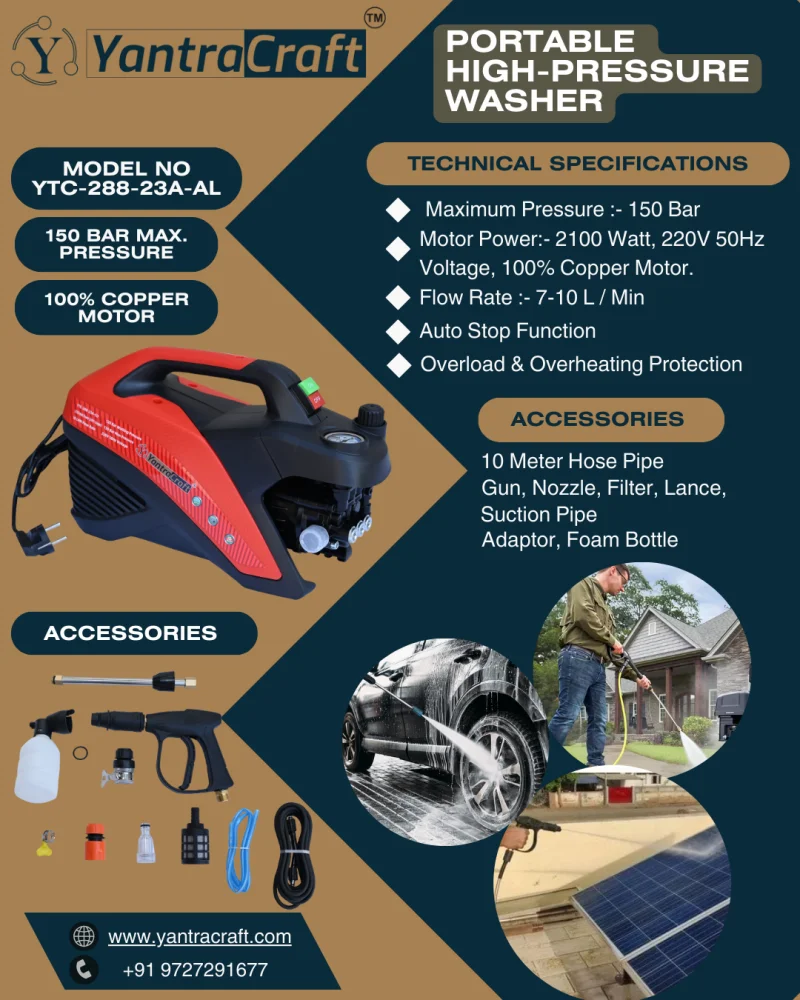 Experience powerful and efficient cleaning with the YantraCraft High-Pressure Washer YTC-288-23B-CU. Designed with a robust 2100W motor made of 100% copper, this high-performance washer ensures durability, reliability, and consistent power. With a maximum pressure of 150 Bar and a flow rate of 10L/min, it tackles tough dirt and grime effortlessly, making it the perfect cleaning companion for cars, bikes, patios, and homes.
