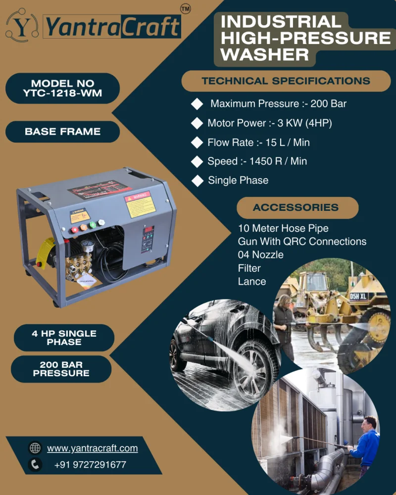 The YantraCraft 200 Bar Wall Mount Industrial Pressure Washer (Model No: YTC-1218-WM) is a powerful, compact, and efficient cleaning solution designed to meet the rigorous demands of industrial and heavy-duty cleaning tasks. Equipped with a robust 3 KW (4HP) single-phase motor, this pressure washer delivers an impressive 200-bar pressure, making it ideal for applications in industries such as automotive, chemical, pharmaceutical, and manufacturing. Its innovative wall-mounted design with a secure base frame ensures optimal space utilization and convenience, making it a top choice for professionals who require high performance and reliability.