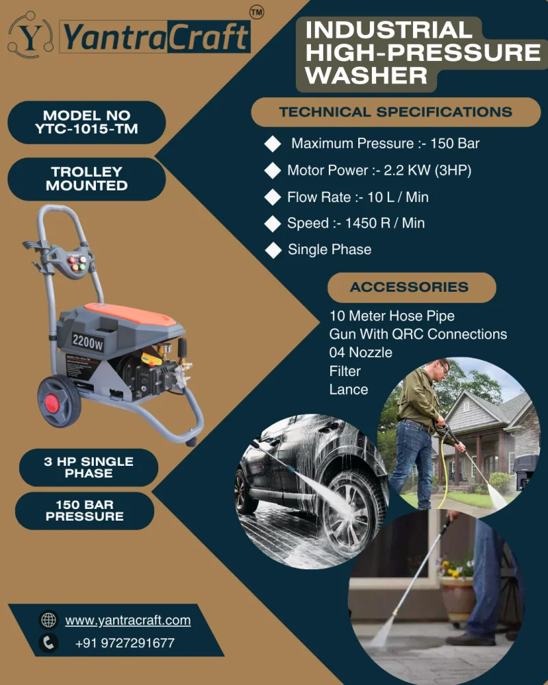 The YantraCraft 160 Bar Trolley Mount Pressure Washer (Model No: YTM-1015-TM) is designed for powerful and efficient cleaning in industrial settings. Equipped with a 2.2 KW (3HP) single-phase motor, this washer delivers up to 150 bars of pressure, ideal for tough cleaning applications such as car washing, industrial machinery cleaning, and specialized uses in chemical and pharmaceutical industries.